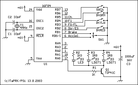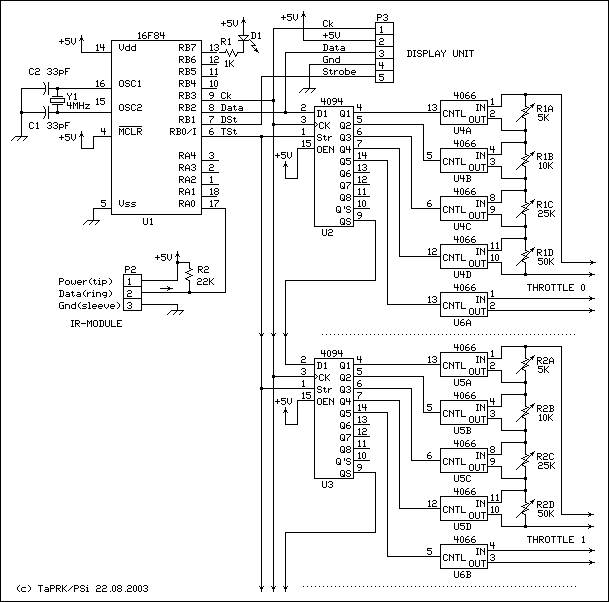 The original IR-system replaced the throttles connected to joystick card. The cmos switches operated the resistor network and pressed the button. The IR receiver resistor networks were connected with interchangeable patch cables to controller sockets, thus replacing wired controllers potentiometer and dir. button The prototype throttles are presently on loan to Mr T.S.Knutsen of Drammen, Norway since August 2003 for testing in Høæstmesse in Oslo in September 2003.