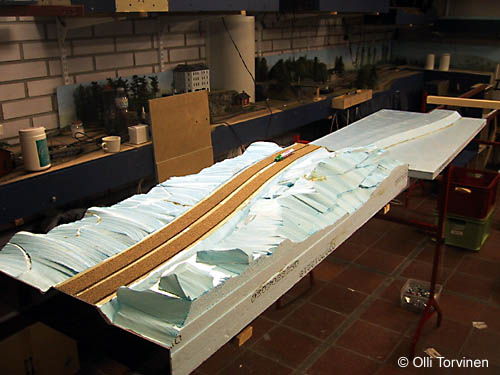 Tunnelitie underpass. The bridge locations were cut open and 3mm (1/8") styrene was used to make the core of the dridges. The foam was only cut away at the location of the bridges, so that the other end is still connected to main part while the glue sets.