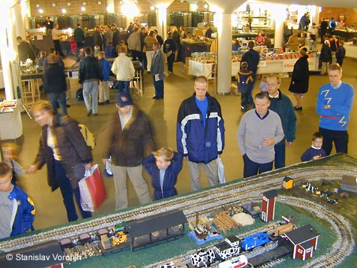 Read more about our Kauniainen project Other layouts at the exhibition General view of the lower lobby. Operating sceniced layouts: In front Nuuuska's LGB layout, next to the left Tampere cub (PiRaKe) layout, and ath the background the Friends of Alpine Railroads' layout. To the left (not visible) was the Laaksonen brother's layout and further to right was Lahti club's (Topparoikka) layout.